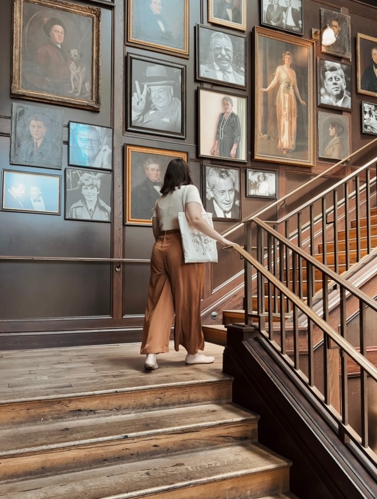 Now, onto the bookstore itself. This building is surprisingly large! It has two floors, an Instagram-worthy staircase photo-op, decorated ceilings, and a warm, dark brown aesthetic. Very dark-academia. The first floor shop offers a variety of items, including home decor, bath products, candles, stationery, and—of course—books. My boyfriend ended up buying a coffee-table book about national parks, and I bought a nonfiction book I’ve been interested in reading: Shakespeare: The Man Who Pays the Rent by Judi Dench and Brendan O’Hea.